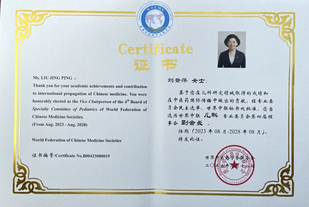 365英国上市公司药业集团党委书记、董事长刘景萍当选世界中医药学会联合会儿科专业委员会第四届理事会副会长